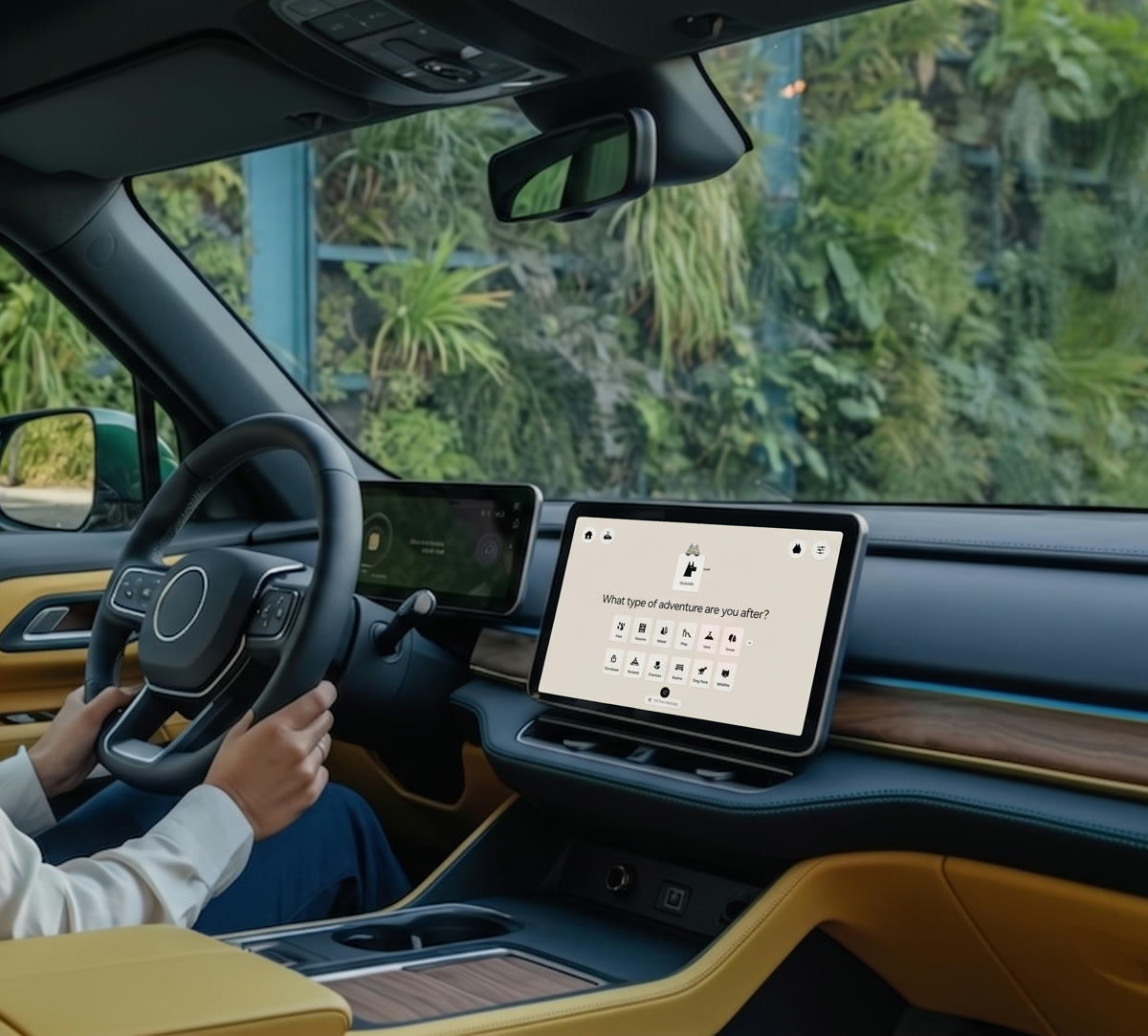 An EV car UI to help find activities near charging stations. Walking directions + charge status sent straight to your phone